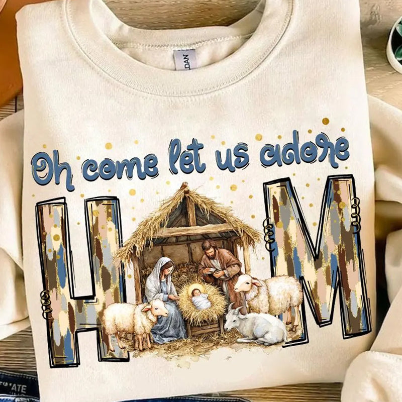 Oh Come Let Us Adore Him Blue/Brown Brushstrokes DTF Transfer